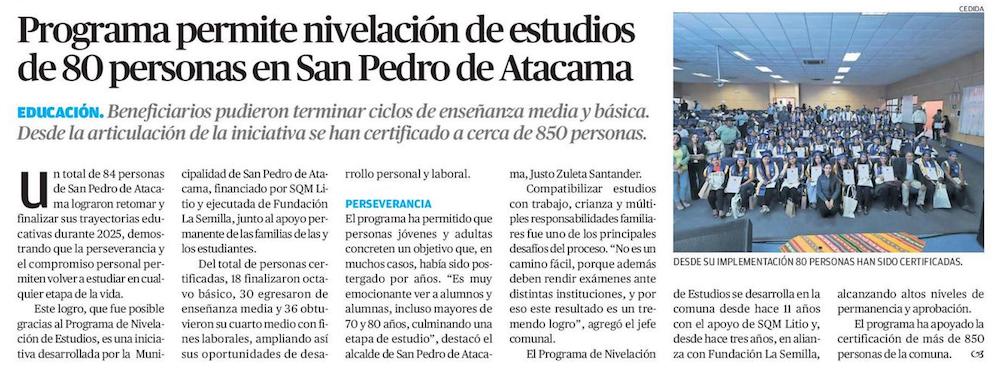 Programa permite nivelación de estudios de 80 personas en San Pedro de Atacama - (El Mercurio de Calama)