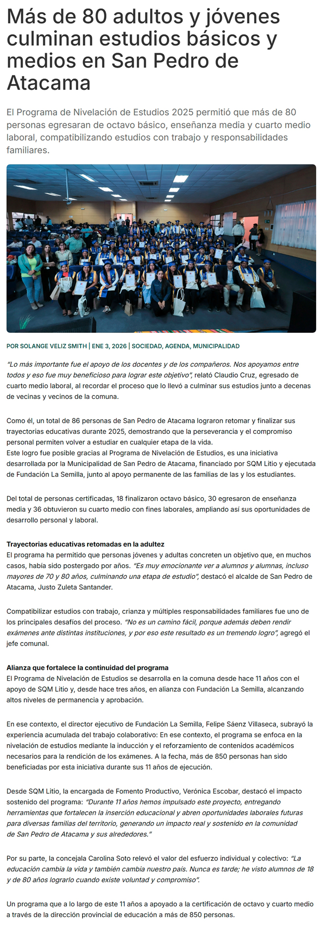 Programa permite nivelación de estudios de 80 personas en San Pedro de Atacama - (El Mercurio de Antofagasta)