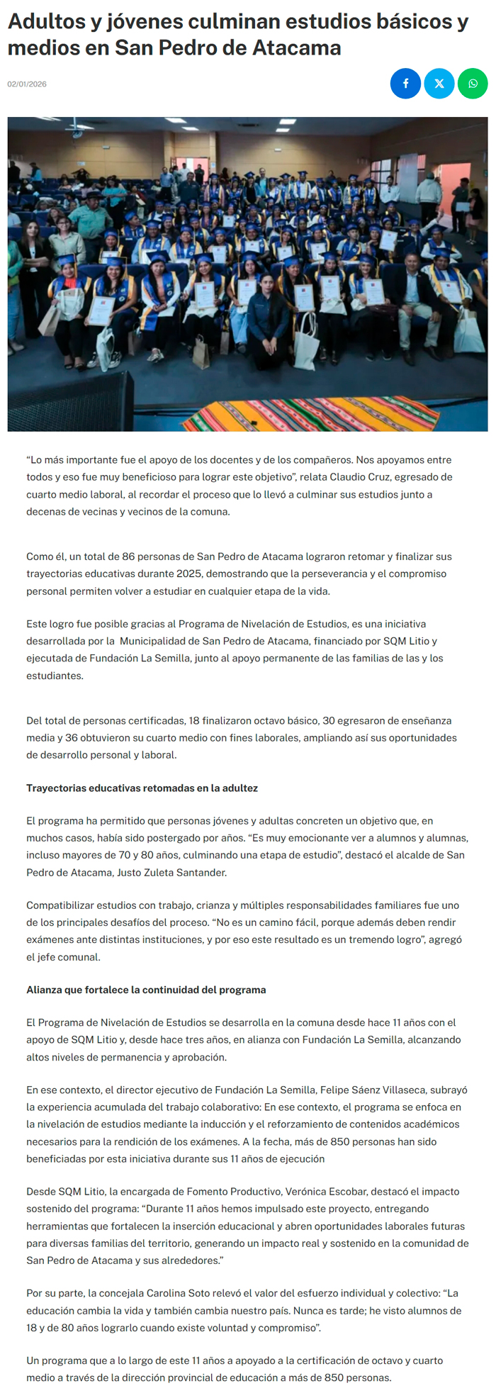 Más de 80 adultos y jóvenes culminan estudios básicos y medios en San Pedro de Atacama - (madero.cl)