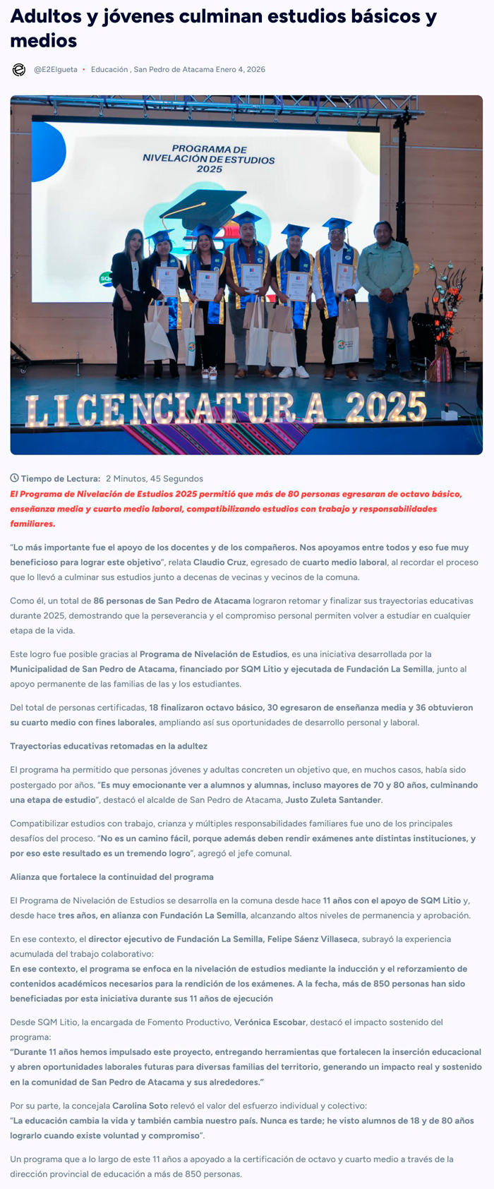 Programa permite nivelación de estudios de 80 personas en San Pedro de Atacama - (El Mercurio de Antofagasta)