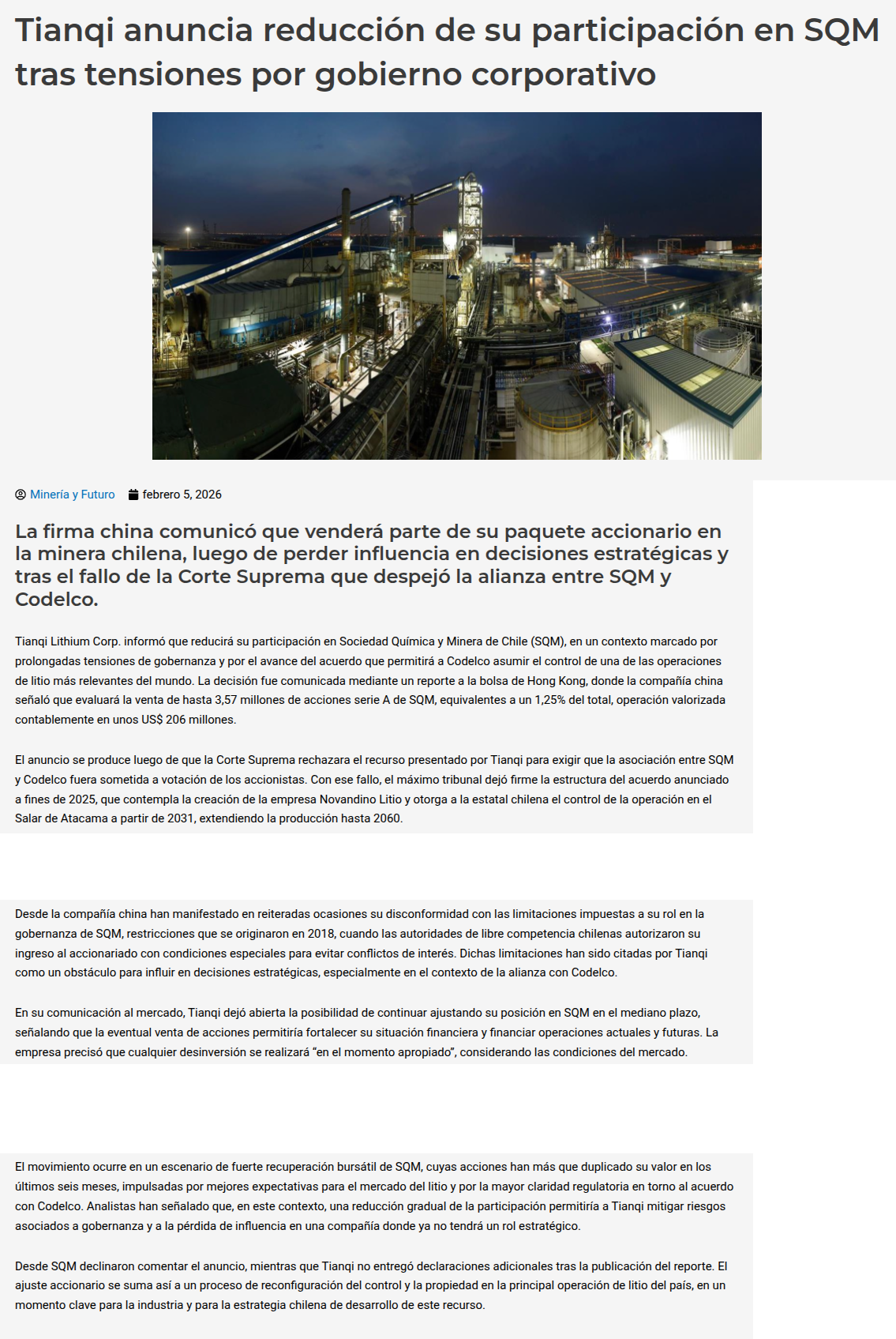 Tianqi Lithium reducirá participación en SQM tras tensiones de gobernanza - (nuevaminería online)