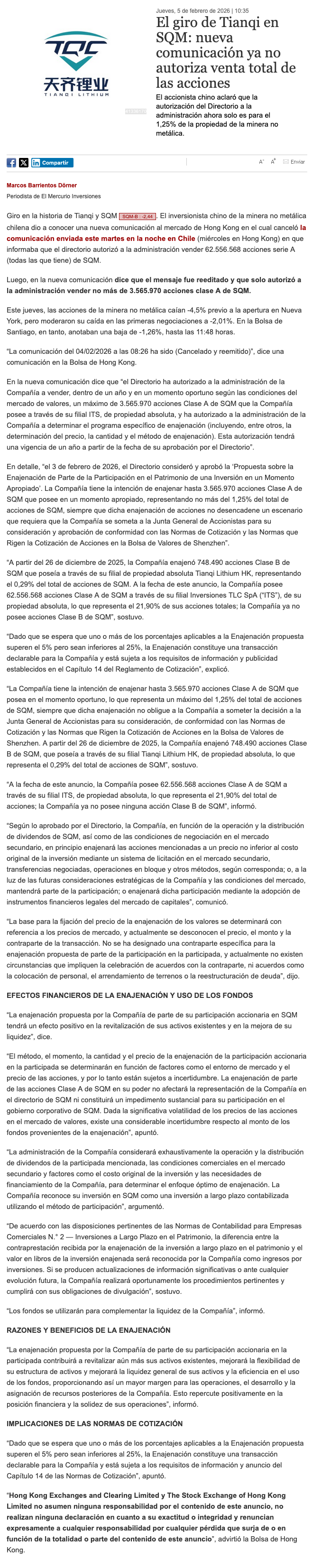 En medio de dudas por salida de Tianqi, continúa caída de acciones de SQM - (El Mercurio de Santiago)