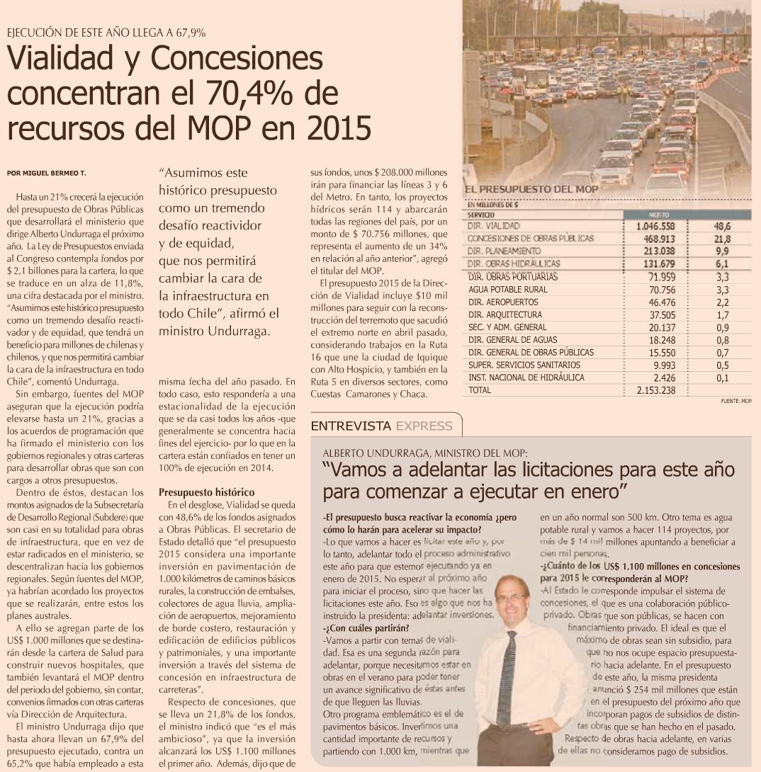 Vivienda y Obras Públicas concentrarán 50% de la inversión fiscal 2015 - (La Tercera)
