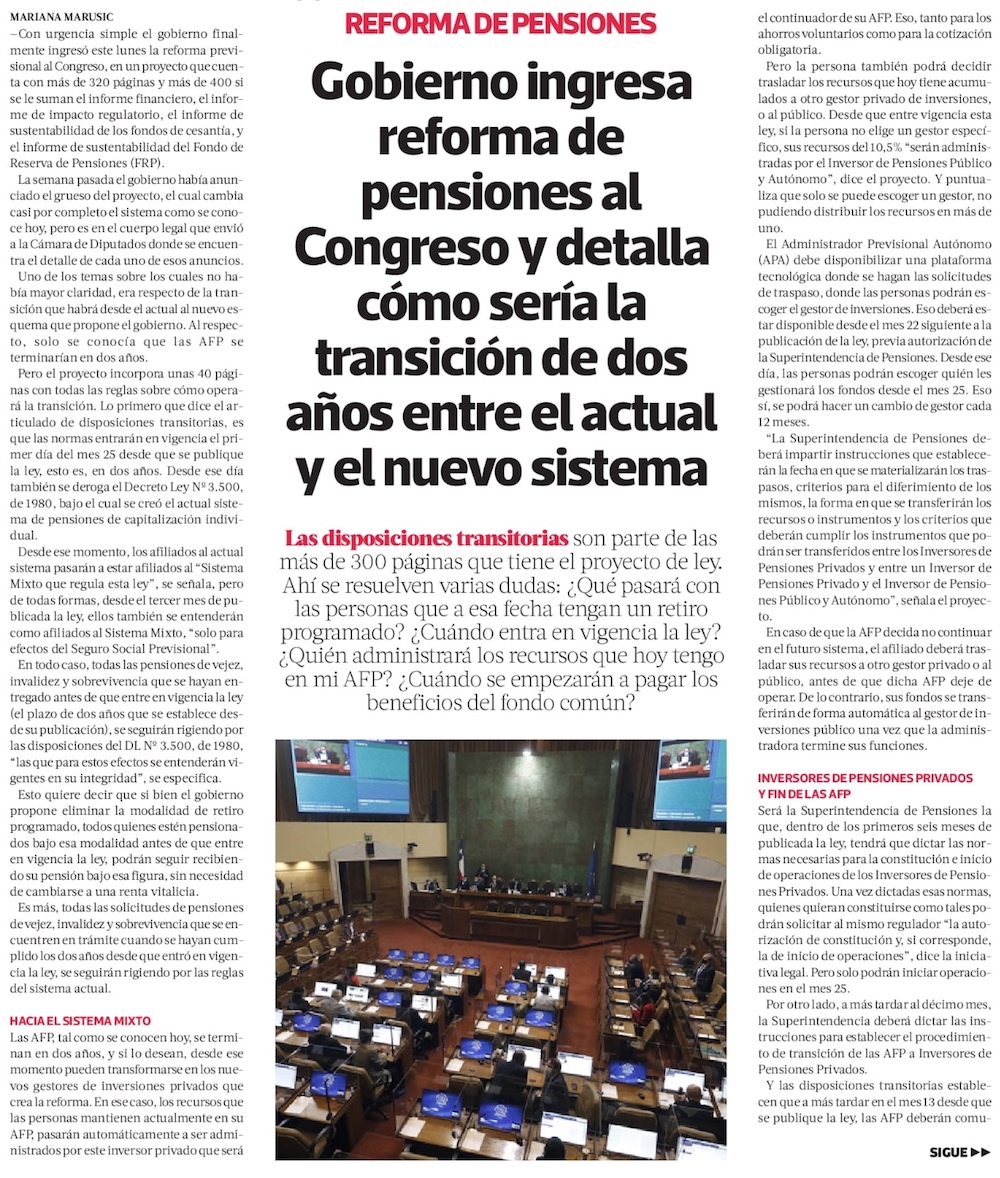Reforma previsional incluye derogación del DL 3.500, opción de autopréstamo y alza del tope imponible impactará cotización de salud - (El Mercurio de Santiago)