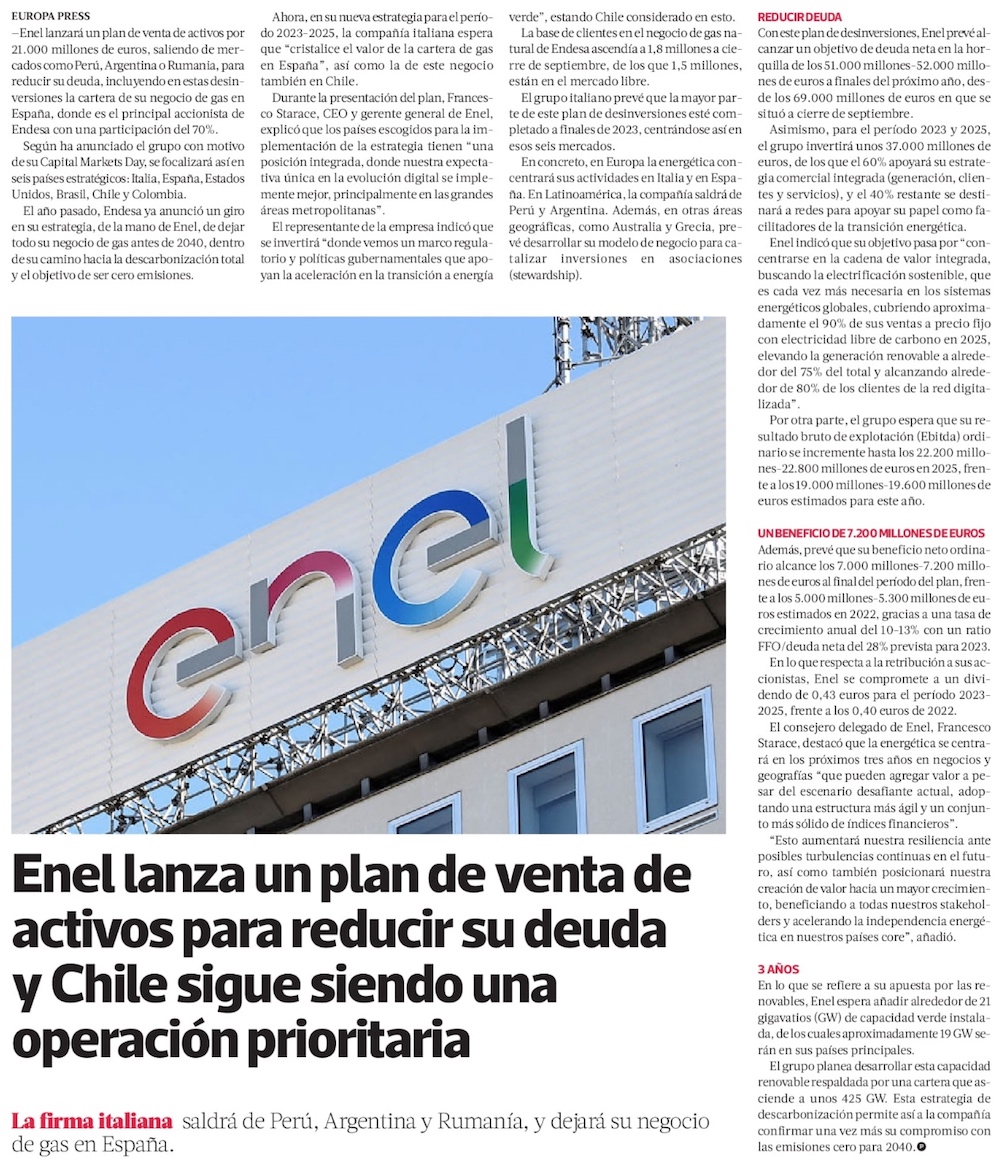 Enel saldrá de Argentina y Perú, en medio de reorganización de sus activos a nivel global - (El Mercurio de Santiago)