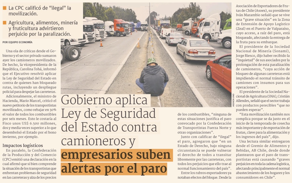 Gobierno confirma que invocará la Ley de Seguridad del Estado por paro de camioneros - (La Tercera)