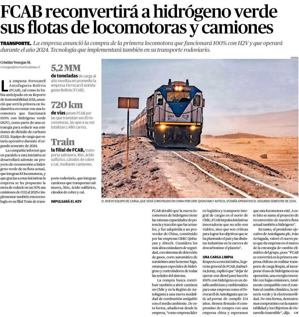 FCAB traerá a Chile la primera locomotora que funcionará con hidrógeno verde - (timeline)