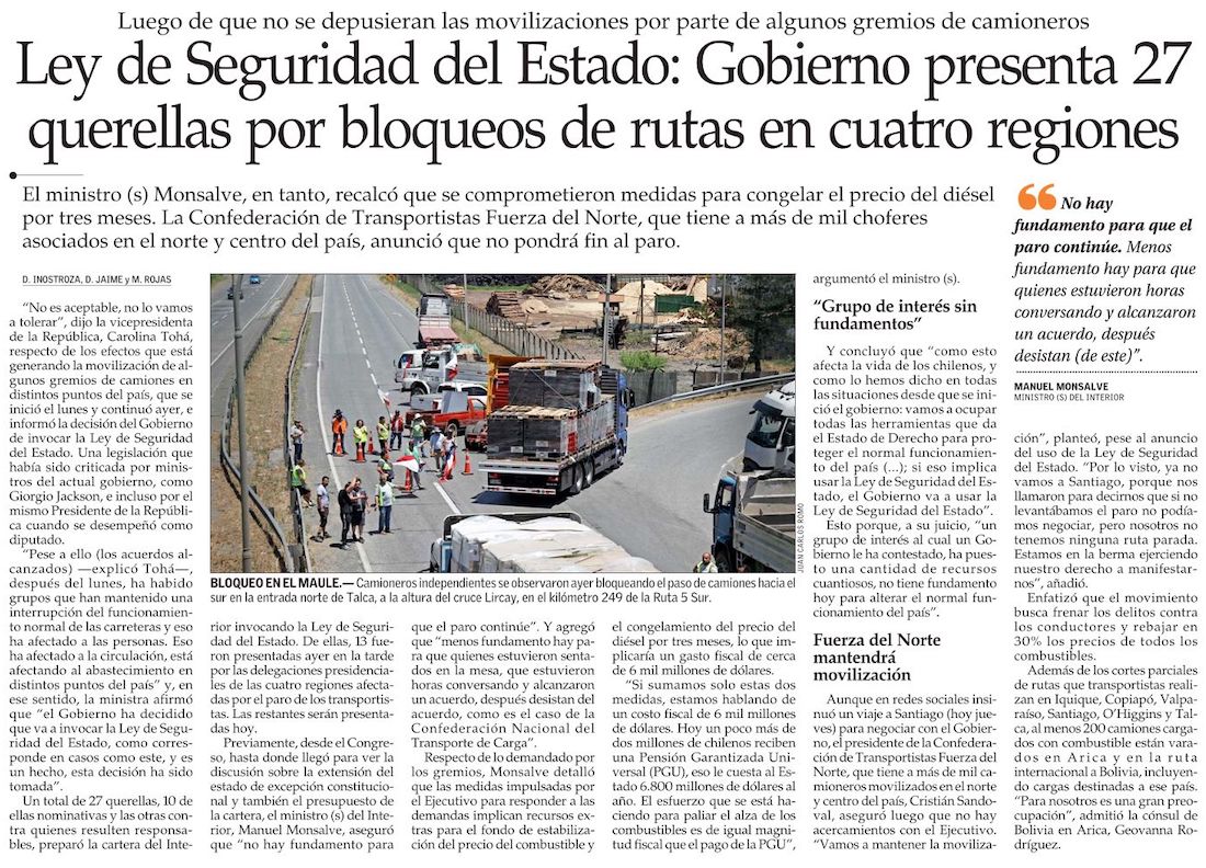 Gobierno confirma que invocará la Ley de Seguridad del Estado por paro de camioneros - (La Tercera)