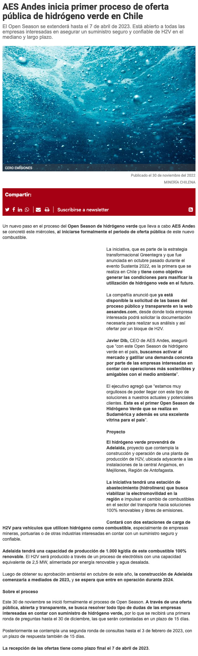 AES Andes inicia el primer proceso de oferta pública de hidrógeno verde en Chile - (biobiochile online)
