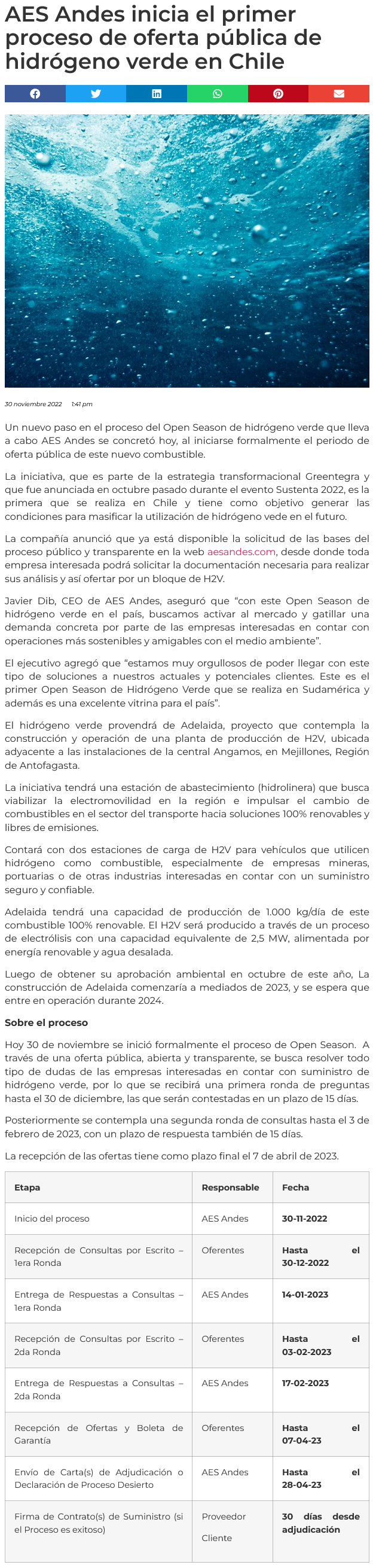 AES Andes inicia el primer proceso de oferta pública de hidrógeno verde en Chile - (biobiochile online)