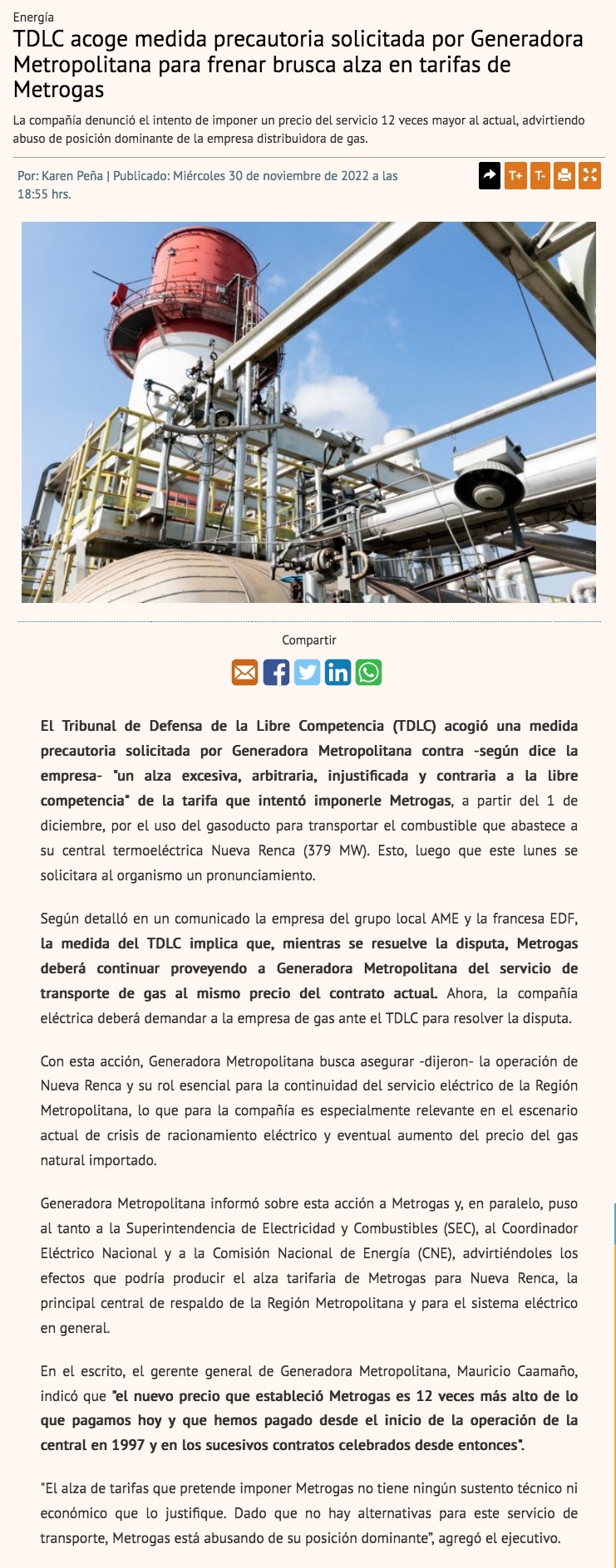 Generadora Metropolitana obtiene medida precautoria solicitada al TDLC para frenar alza de tarifas de Metrogas - (Pulso Online)