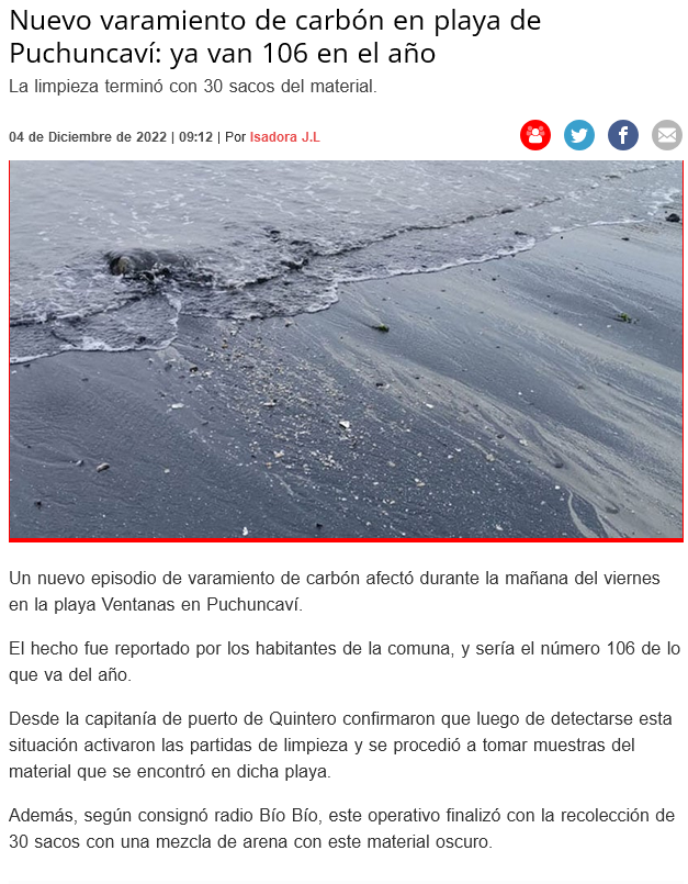 Playa Ventanas de Puchuncaví sufre nuevo varamiento de carbón: van 106 episodios sólo en 2022 - (biobiochile online)