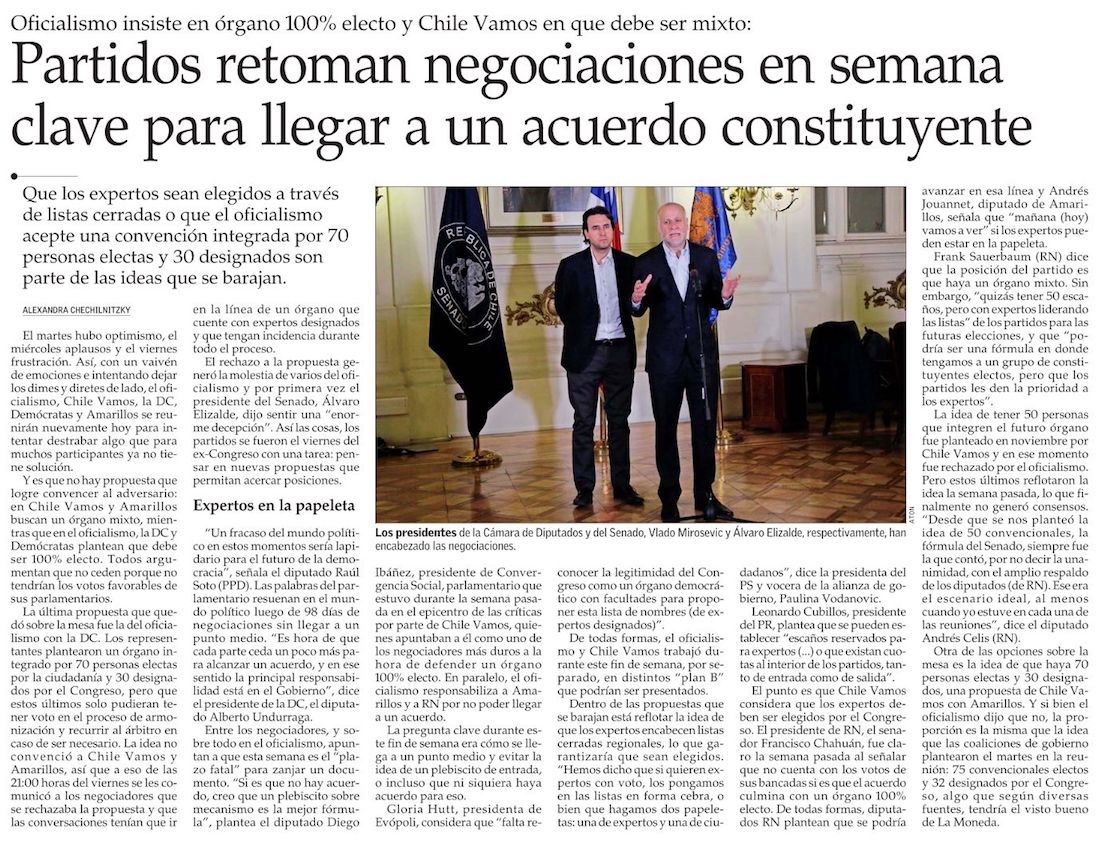 Nueva Constitución: oficialismo empuja el plebiscito ante la imposibilidad de llegar a acuerdo y la oposición insiste en expertos con voto designados por el Congreso - (La Tercera)