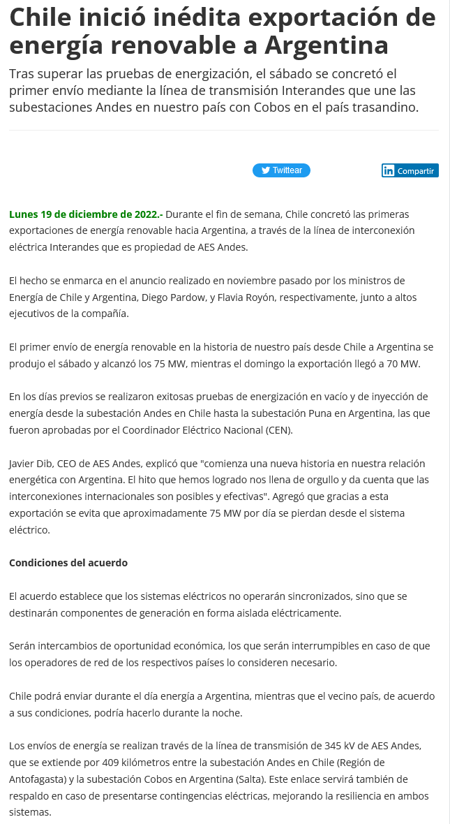 Chile inicia envío de energía renovable a Argentina a través de línea de transmisión de AES Andes - (revistaenergia.cl)