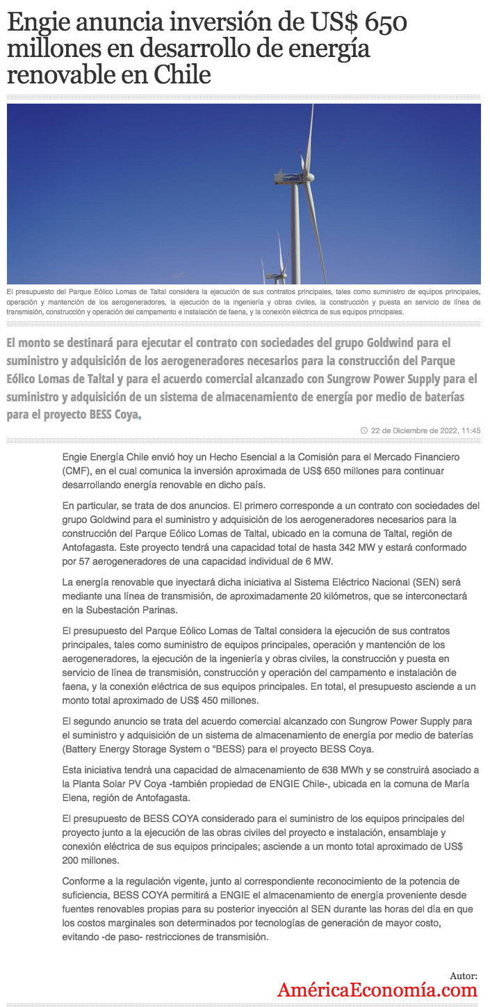 Engie detalla inversiones por US$ 650 millones para el desarrollo de energías renovable - (Diario Financiero)