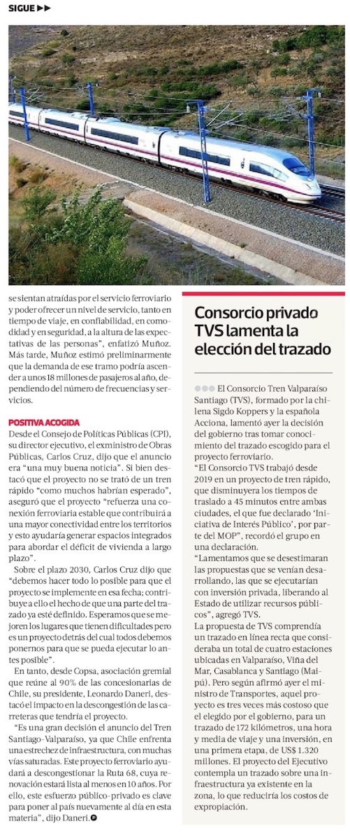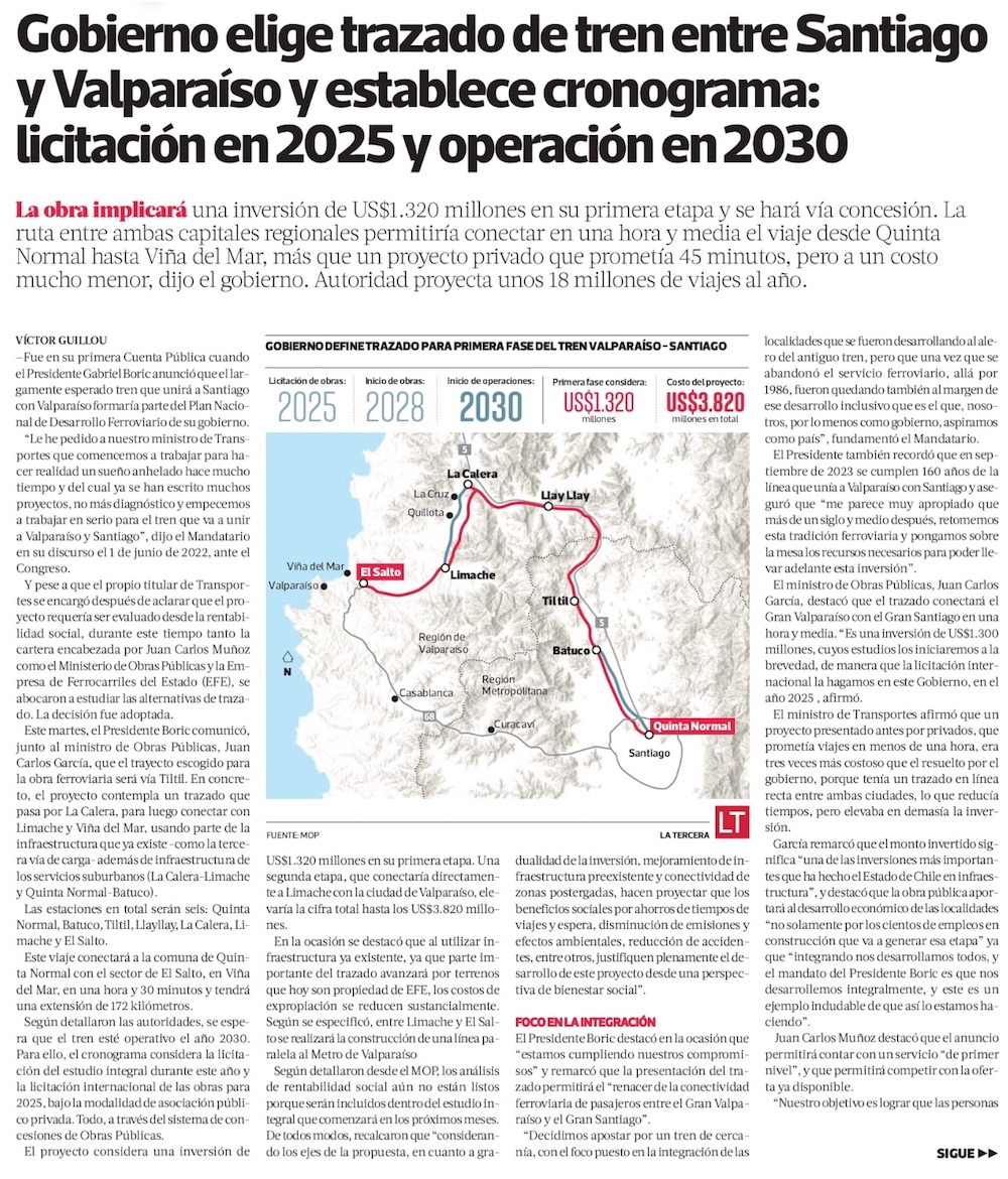 Gobierno desestima tren rápido a Valparaíso y opta por nuevo plan de US$ 1.320 millones - (El Mercurio de Santiago)