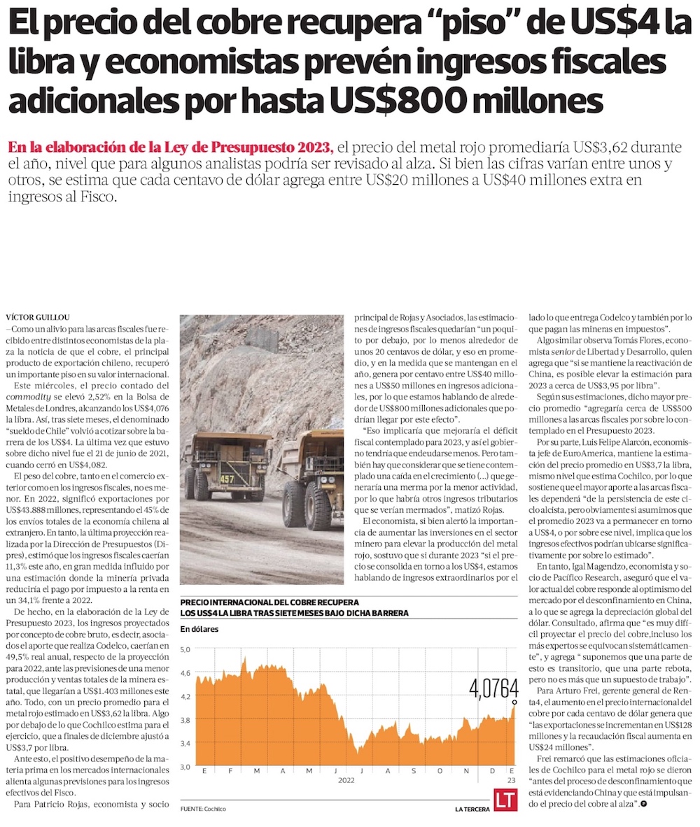 Cobre trepa con fuerza y se posiciona en los US$4 la libra por primera vez desde fines de junio de 2022 - (emol)