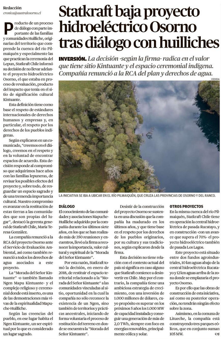 Statkraft desiste del proyecto hidroeléctrico Osorno tras diálogo con comunidades - (El Austral de Osorno)