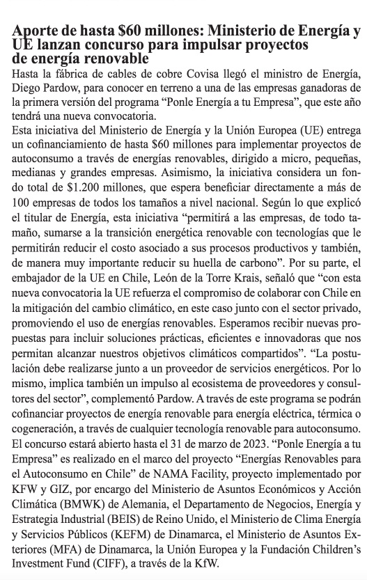 Aporte de hasta $60 millones: Ministerio de Energía y UE lanzan concurso para impulsar proyectos de energía renovable - (emol)