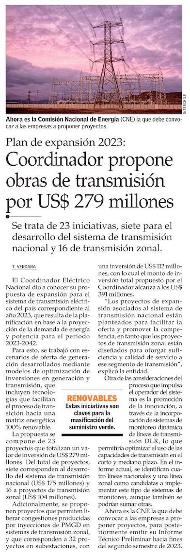 Coordinador Eléctrico Nacional publica propuesta de expansión del Sistema de Transmisión del año 2023 por US$ 279 millones - (Estrategia)