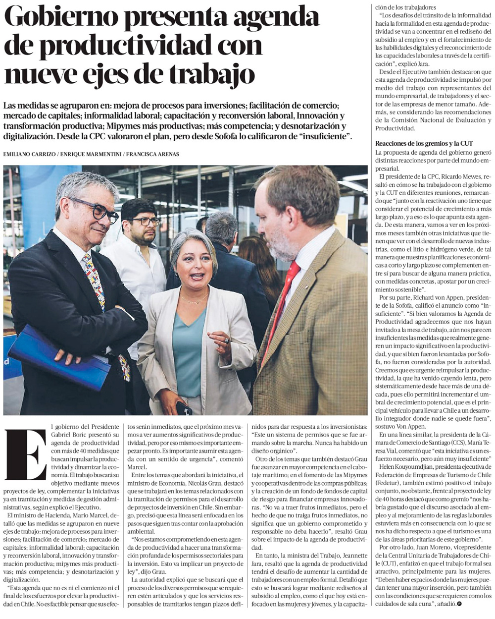 Gobierno estrena agenda de productividad con 46 medidas y empresarios la tildan de insuficiente - (El Mercurio de Santiago)