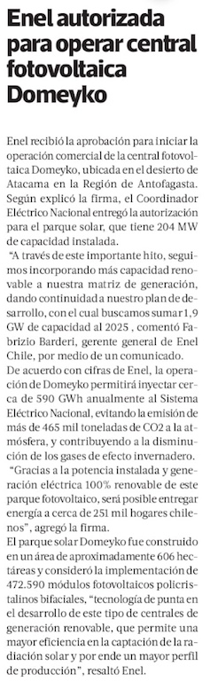 Enel recibió la autorización para iniciar la operación comercial de la central fotovoltaica Domeyko - (Pulso Online)