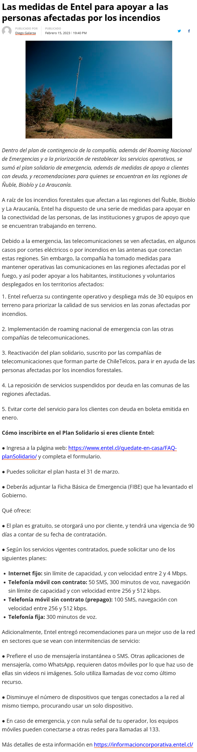 Las medidas de Entel para apoyar a las personas afectadas por los incendios - (La Tribuna)