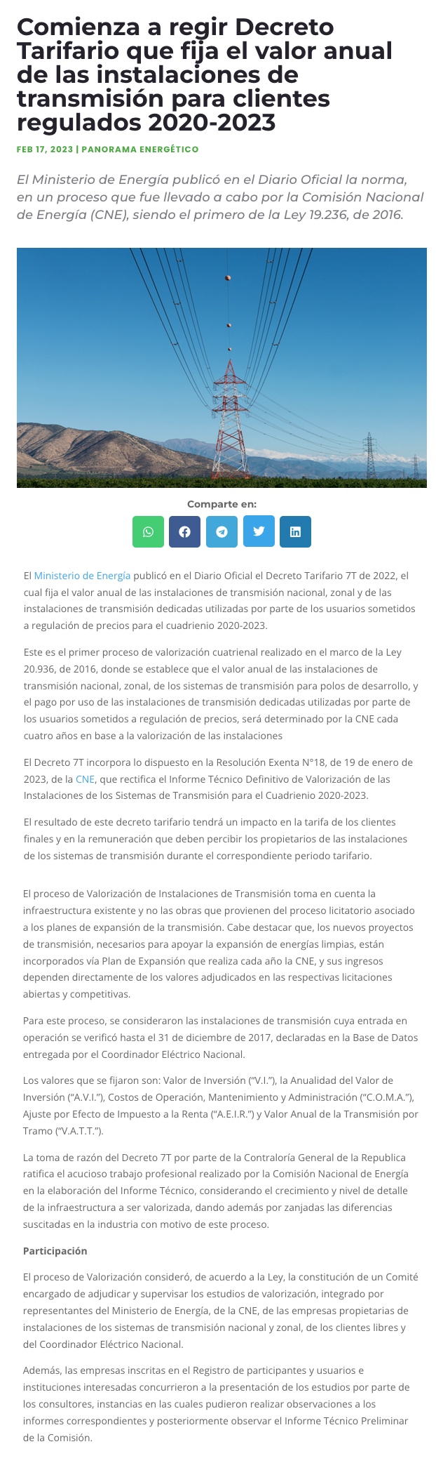Comienza a regir Decreto Tarifario que fija el valor anual de las instalaciones de transmisión para clientes regulados 2020-2023 - (portalinnova.cl)