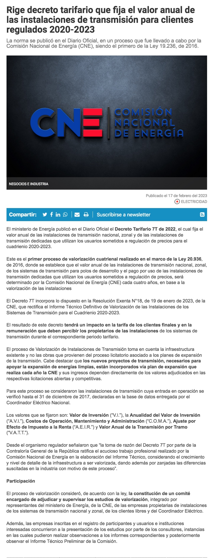Comienza a regir Decreto Tarifario que fija el valor anual de las instalaciones de transmisión para clientes regulados 2020-2023 - (portalinnova.cl)
