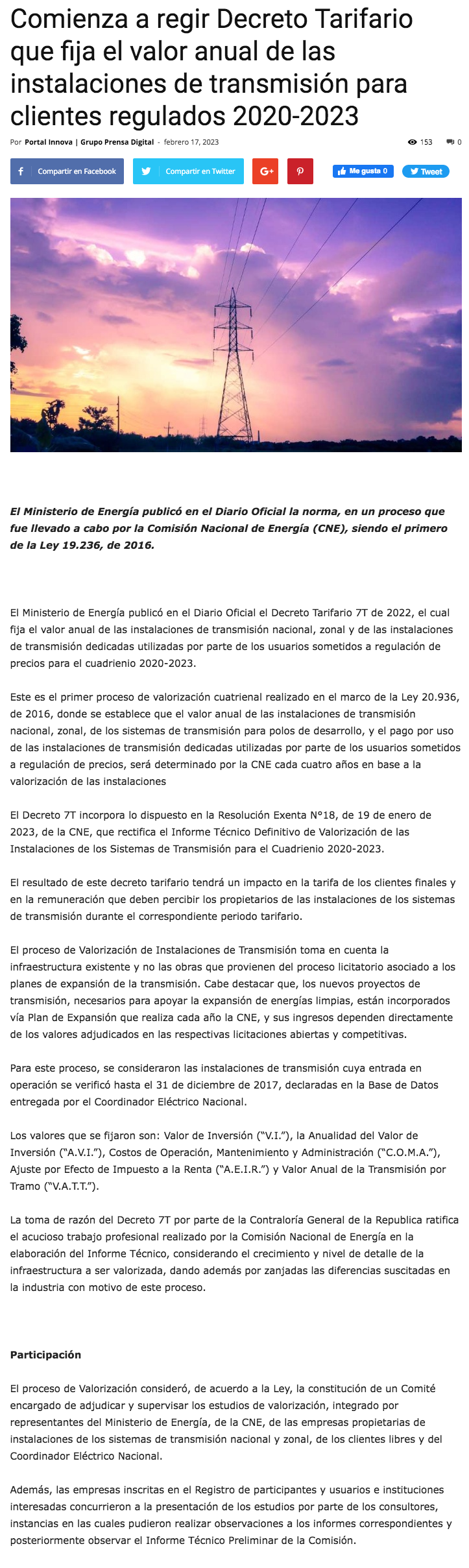 Comienza a regir Decreto Tarifario que fija el valor anual de las instalaciones de transmisión para clientes regulados 2020-2023 - (portalinnova.cl)