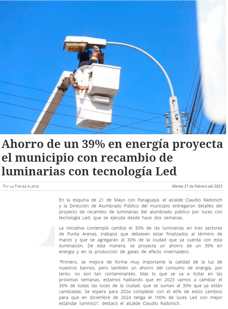 Municipio ahorrará 40% de energía tras recambio de luminarias - (El Pingüino)