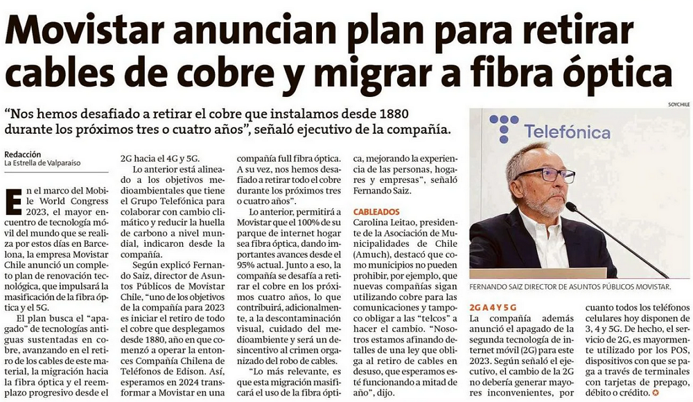 Movistar Chile anuncia plan para el retiro de tecnología basada en cables de cobre y el uso del 2G - (El Mercurio de Santiago)