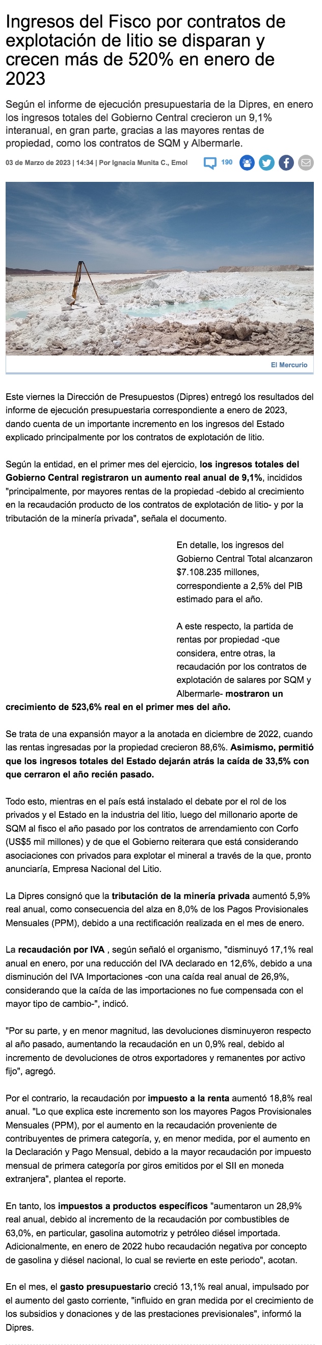 Ingresos por litio al fisco en lo que va del año ya superan meta de todo 2023 y proyecciones dependen de China - (El Mercurio de Santiago)