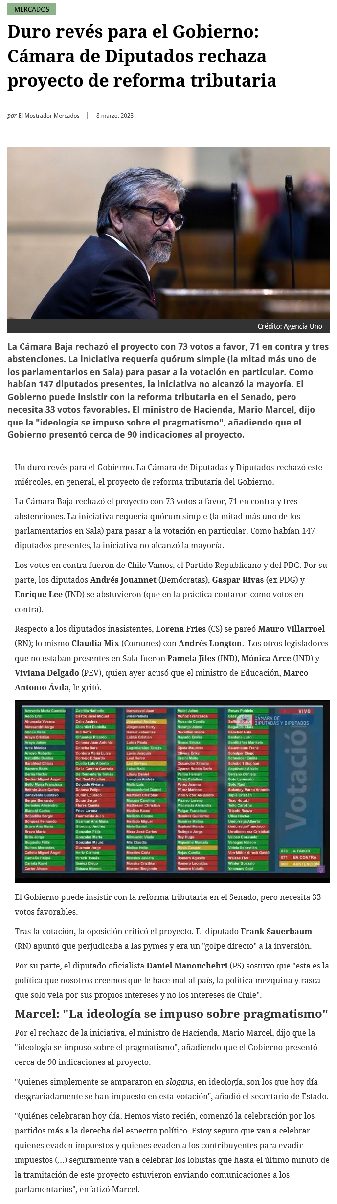 Cámara de Diputados propina la más dura derrota al programa de gobierno y rechaza la reforma tributaria - (Pulso)