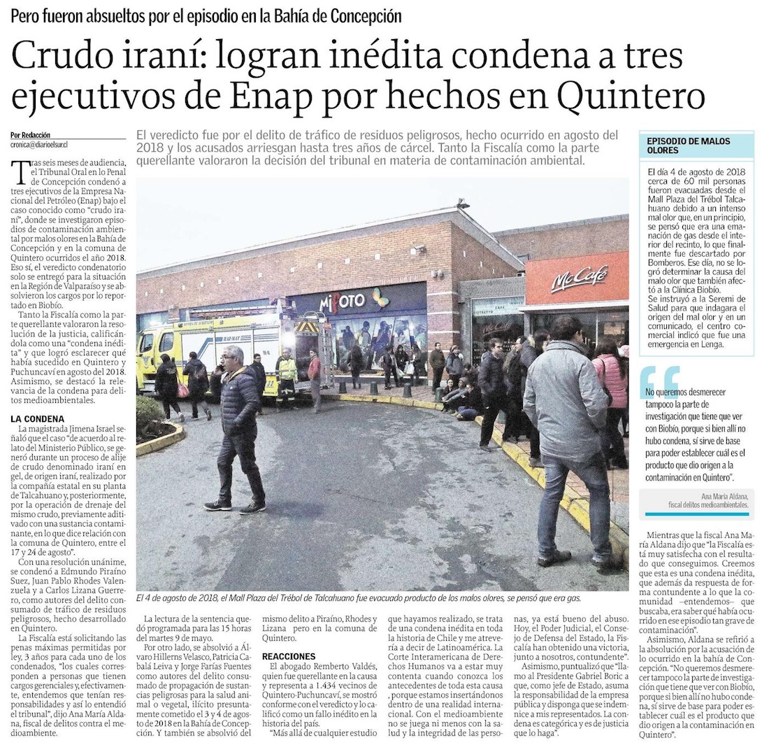 Juicio por intoxicados en Quintero arroja que tres ejecutivos de Enap son culpables de tráfico de residuos - (El Mercurio de Santiago)