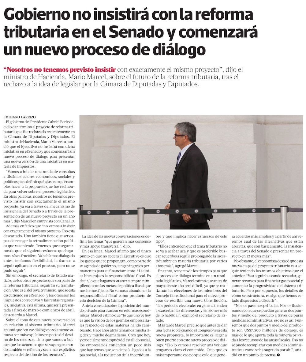 Ministro Marcel define lineamientos de nueva estrategia tributaria y oposición prepara propuesta propia - (El Mercurio de Santiago)