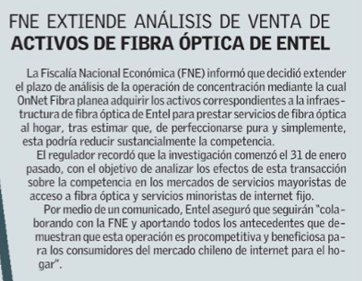 FNE extiende a Fase 2 investigación por venta de fibra óptica de Entel a OnNet Fibra ya que "podría reducir sustancialmente la competencia" - (DF Online)