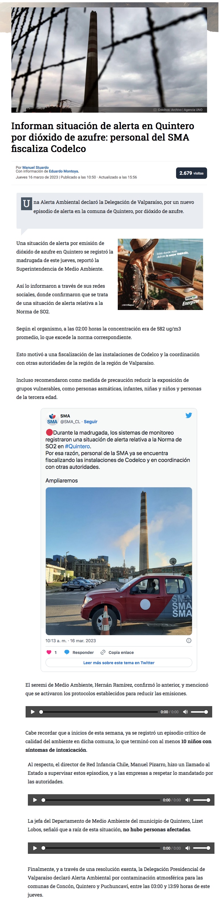Superintendencia de Medio Ambiente fiscalizó Codelco en Ventanas por alerta de dióxido de azufre - (soyvalparaiso)