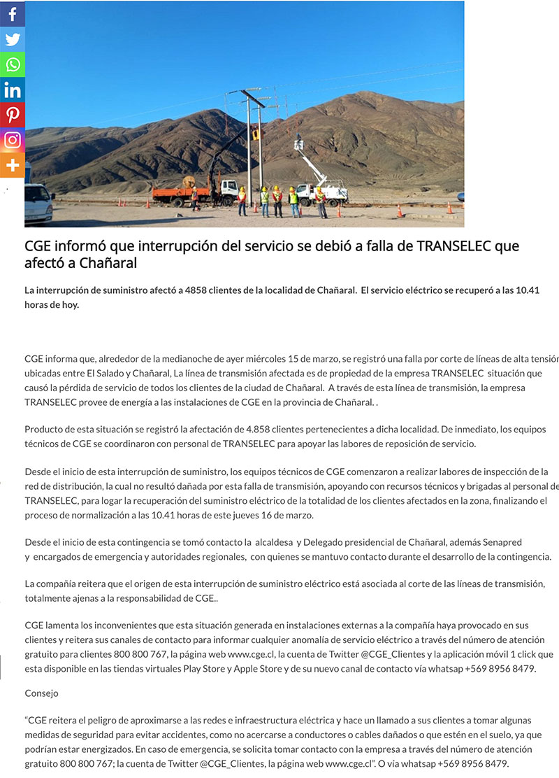 CGE informó que interrupción del servicio se debió a falla de Transelec que afectó a Chañaral - (elzorronortino.cl)