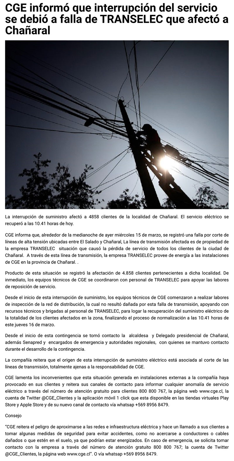 CGE informó que interrupción del servicio se debió a falla de Transelec que afectó a Chañaral - (Maray Online)