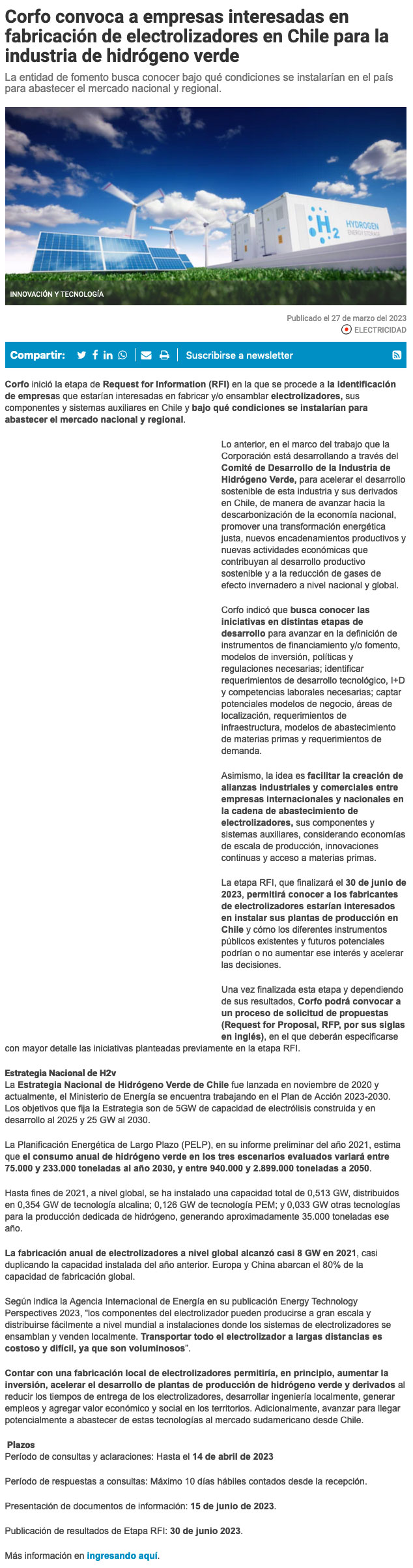 Hidrógeno verde : Corfo inicia proceso para que los fabricantes de electrolizadores se instalen en Chile - (El Mercurio de Santiago)