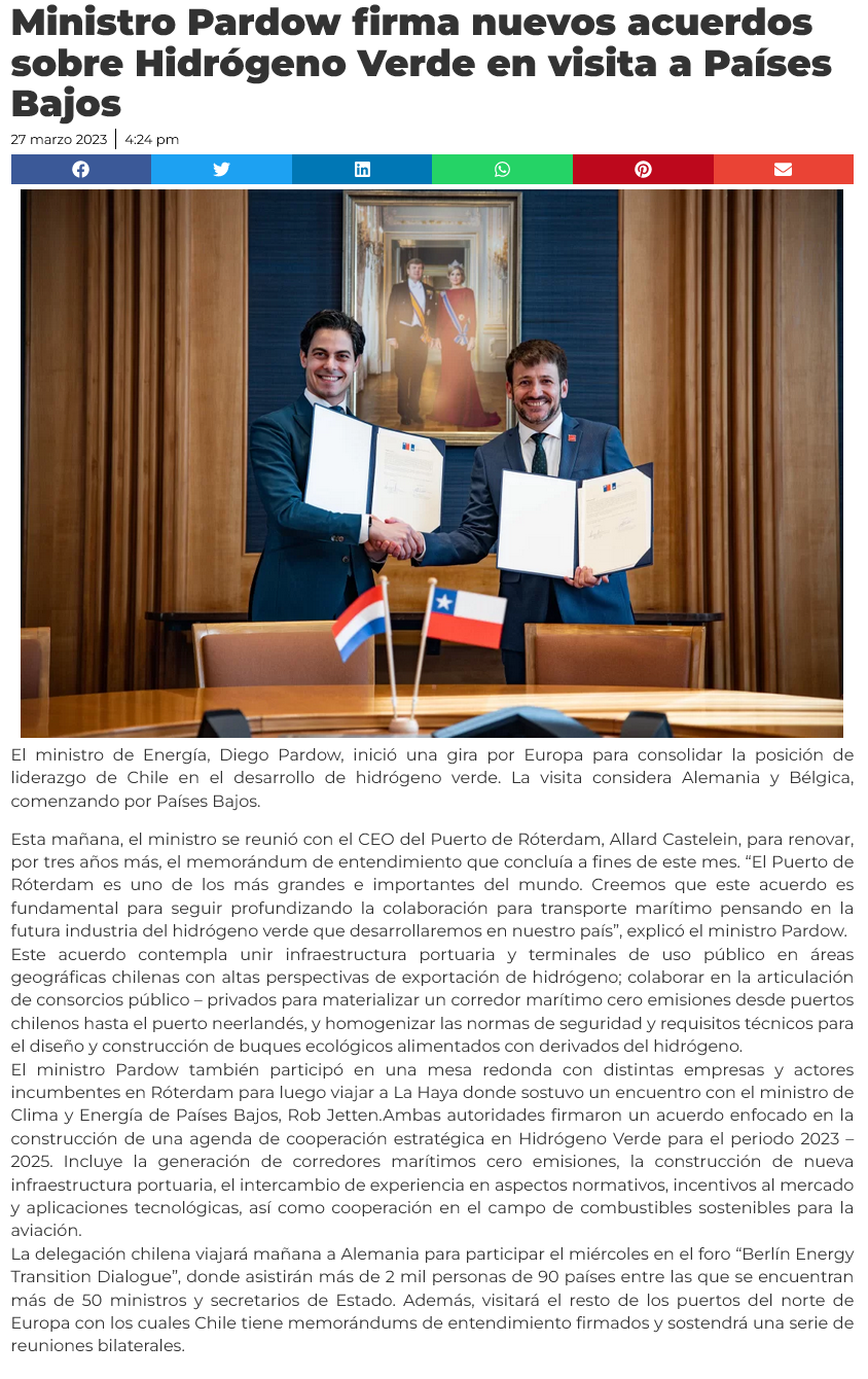 Pardow firma acuerdos sobre hidrógeno verde en Países Bajos - (Pulso)
