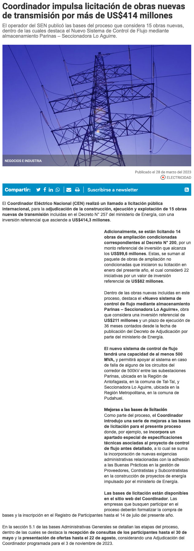Coordinador Eléctrico llama a licitación de nuevas obras de transmisión que incluyen por primera vez sistema de almacenamiento - (Pulso Online)