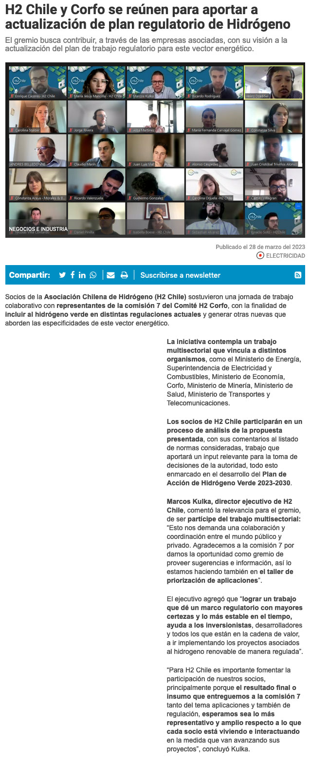 H2 Chile y Corfo se reúnen para aportar a actualización de plan regulatorio de Hidrógeno - (revistaei.cl)