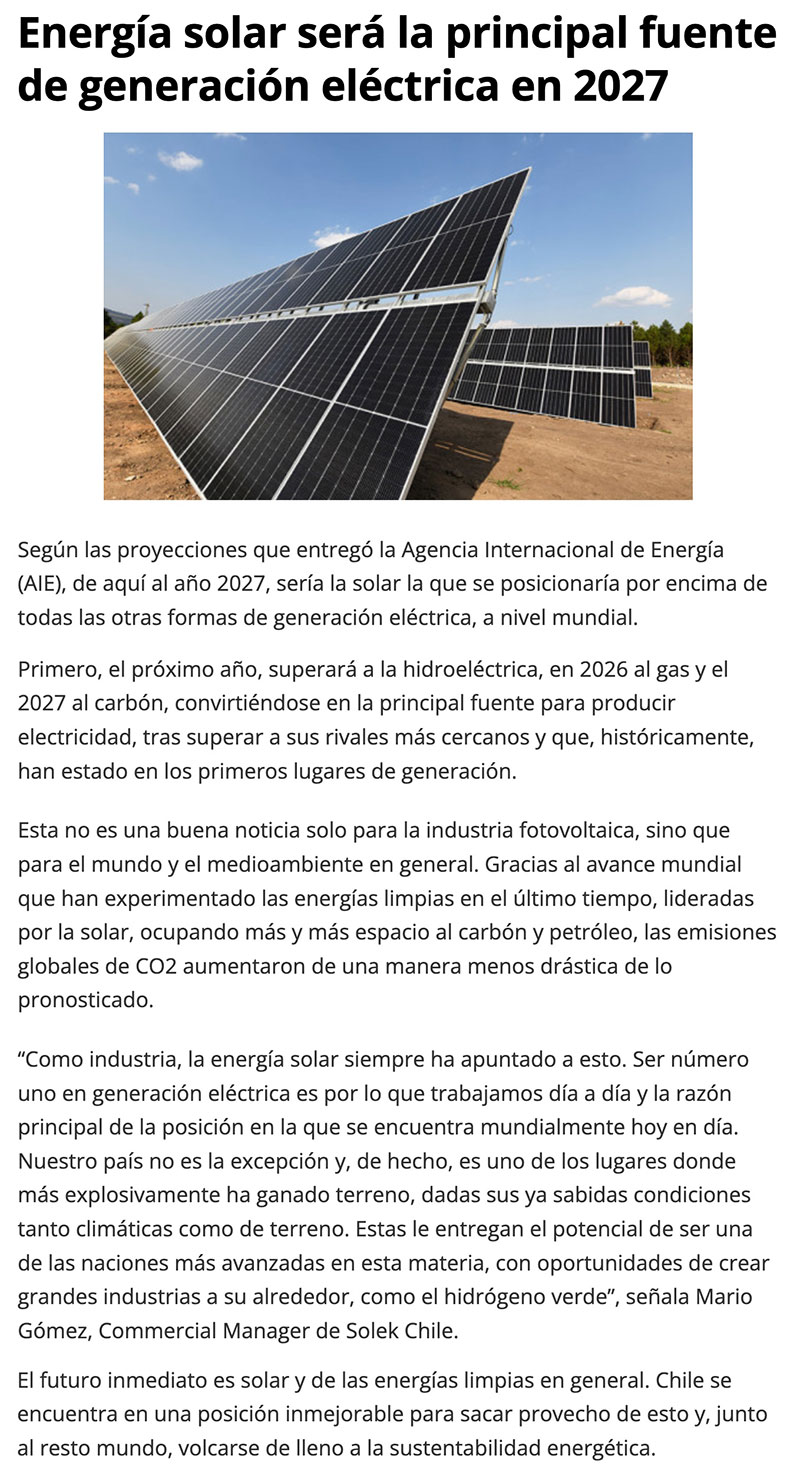 Energía solar será la principal fuente de generación eléctrica en 2027 - (portalminero)