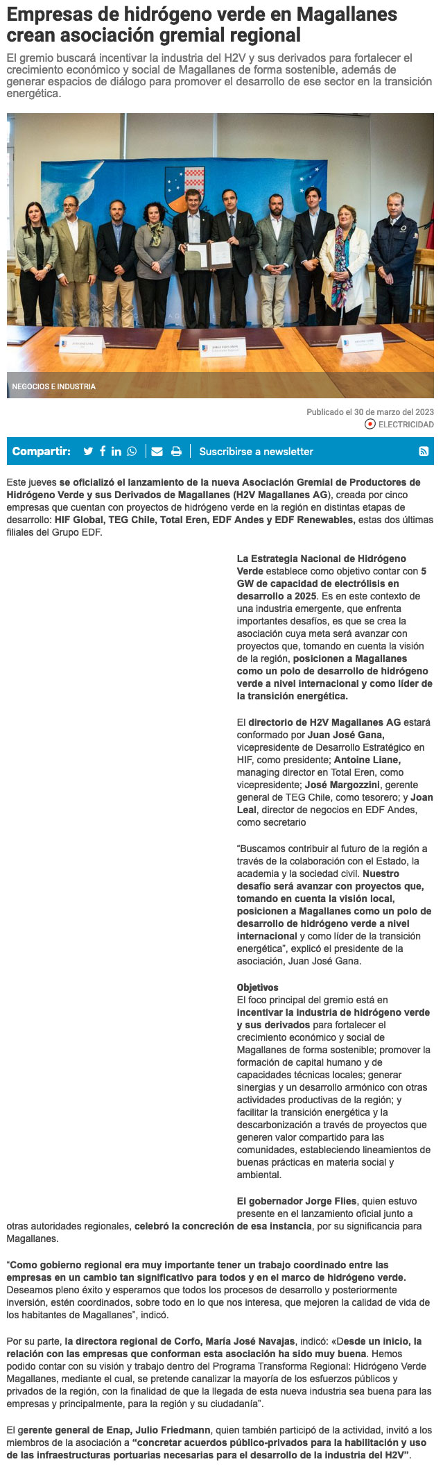 Empresas de hidrógeno verde en Magallanes crean asociación gremial regional - (h2news.cl)