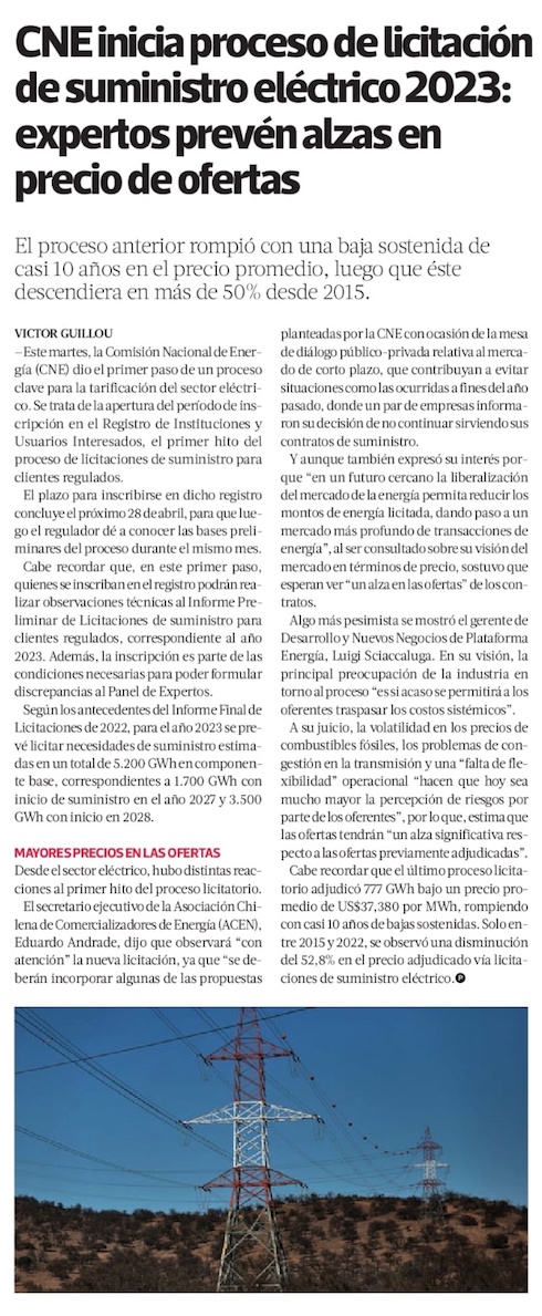 CNE inicia proceso para licitación de 2023 de clientes regulados de electricidad - (El Mercurio de Santiago)
