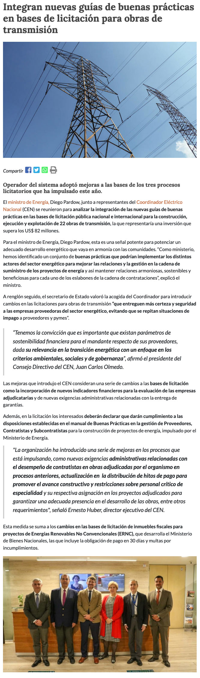 Energía y CEN valoran la integración de guías de buenas prácticas en bases de licitación para obras de transmisión - (ceinoticias.cl)