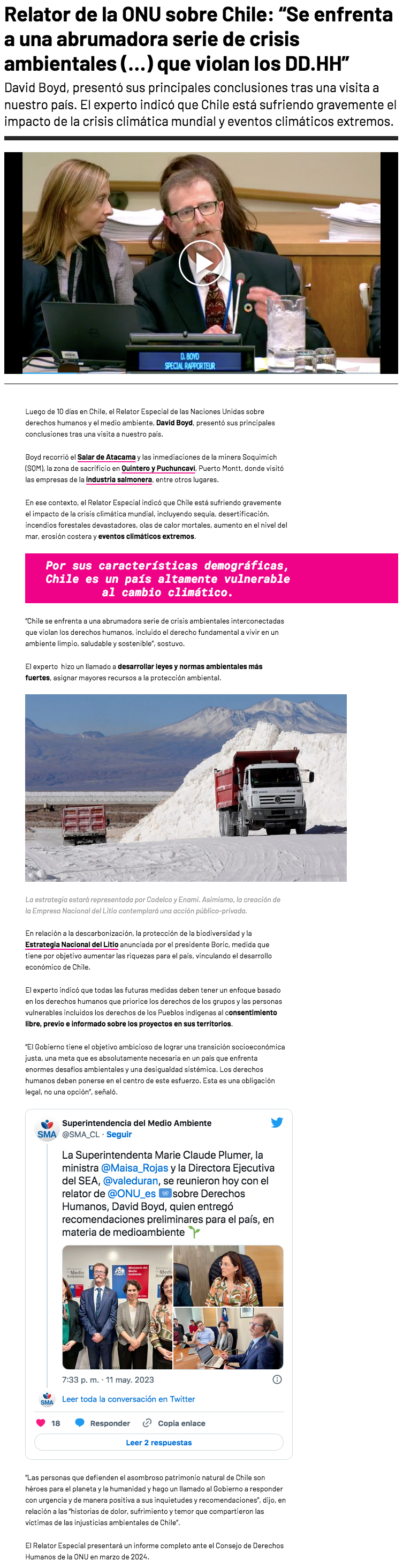 Relator de la ONU: “Chile enfrenta crisis ambientales atemorizantes que han violado los DDHH” - (El Mostrador)