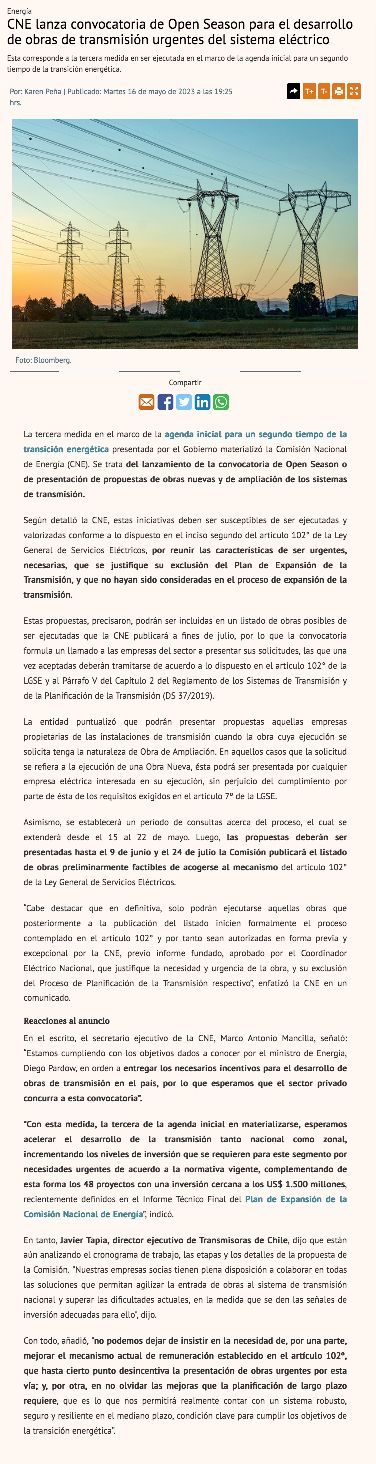 Comisión Nacional de Energía abre convocatoria de open season para el desarrollo de obras de transmisión urgentes - (revistaei.cl)